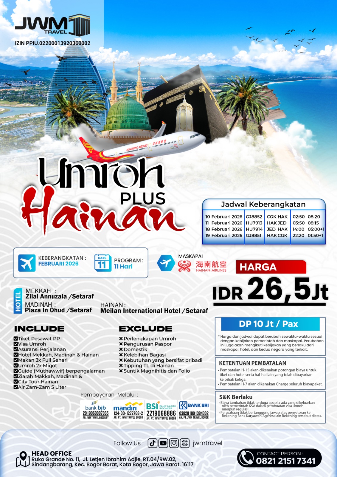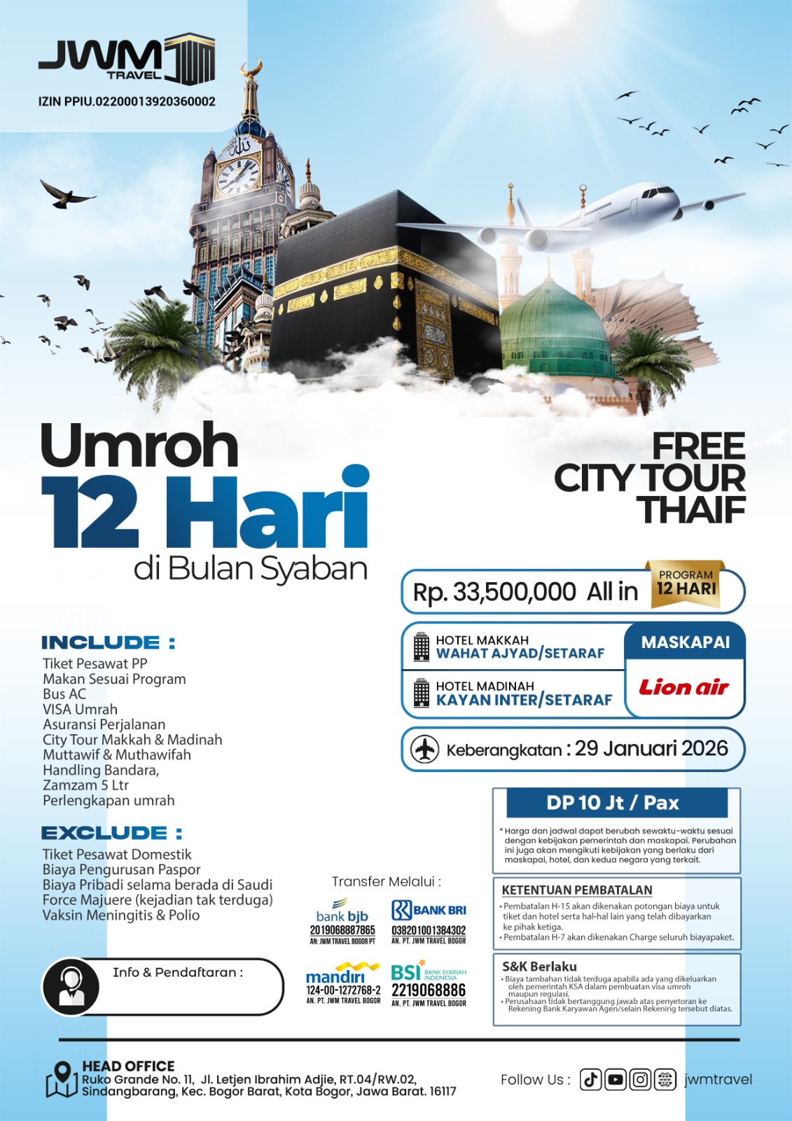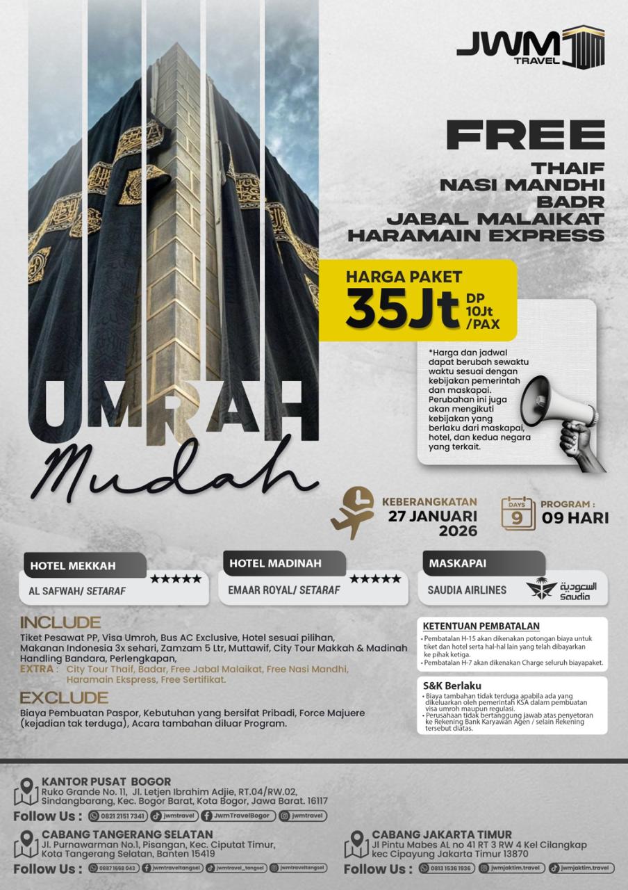 Pendaftaran bisa dilakukan dengan mudah secara online melalui link resmi kami atau langsung datang ke kantor JWM Travel terdekat. Tim kami akan membantu proses administrasi hingga persiapan keberangkatan dengan lengkap.